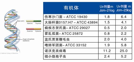 目前在国内泳池紫外线消毒领域中最常用的是低压紫外线灯管,其是一种管内气压小于103Pa,只有单色紫外线光谱输出,单只灯管功率低于100W的传统紫外线杀菌器。而现在市场上的中压紫外线杀菌器,可以做到灯管104-106Pa,100nm-400nm多谱端连续紫外线光谱输出,单只灯管功率高达7300W。与臭氧和氯消毒相比,中压紫外线消毒具有无污染,绿色环保;占用空间小,安装操作简便;运行费用低,工作寿命长;杀菌功能不受环境影响。所以中压紫外线杀菌器能杀死的细菌种类和分解化学物的能力更加强大。根据美国环保局UV手册(2006年11月)标准,杀死一般有机体所需的UV剂量如下: