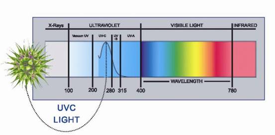 紫外线光是位于X-射线和可见光之间的电磁频谱的电磁辐射,有许多有益的特性。紫外线(UV)被分为四个主要类别,UV-A,UV-B,UV-C和真空紫外线。240和290毫微米(nm)之间的区域,265nm的波长紫外线通常被称为杀菌范围的UV-C更有效破坏微生物有机体或防止有机体的复制,使之最终破坏,达到消毒的目的(如图1)。